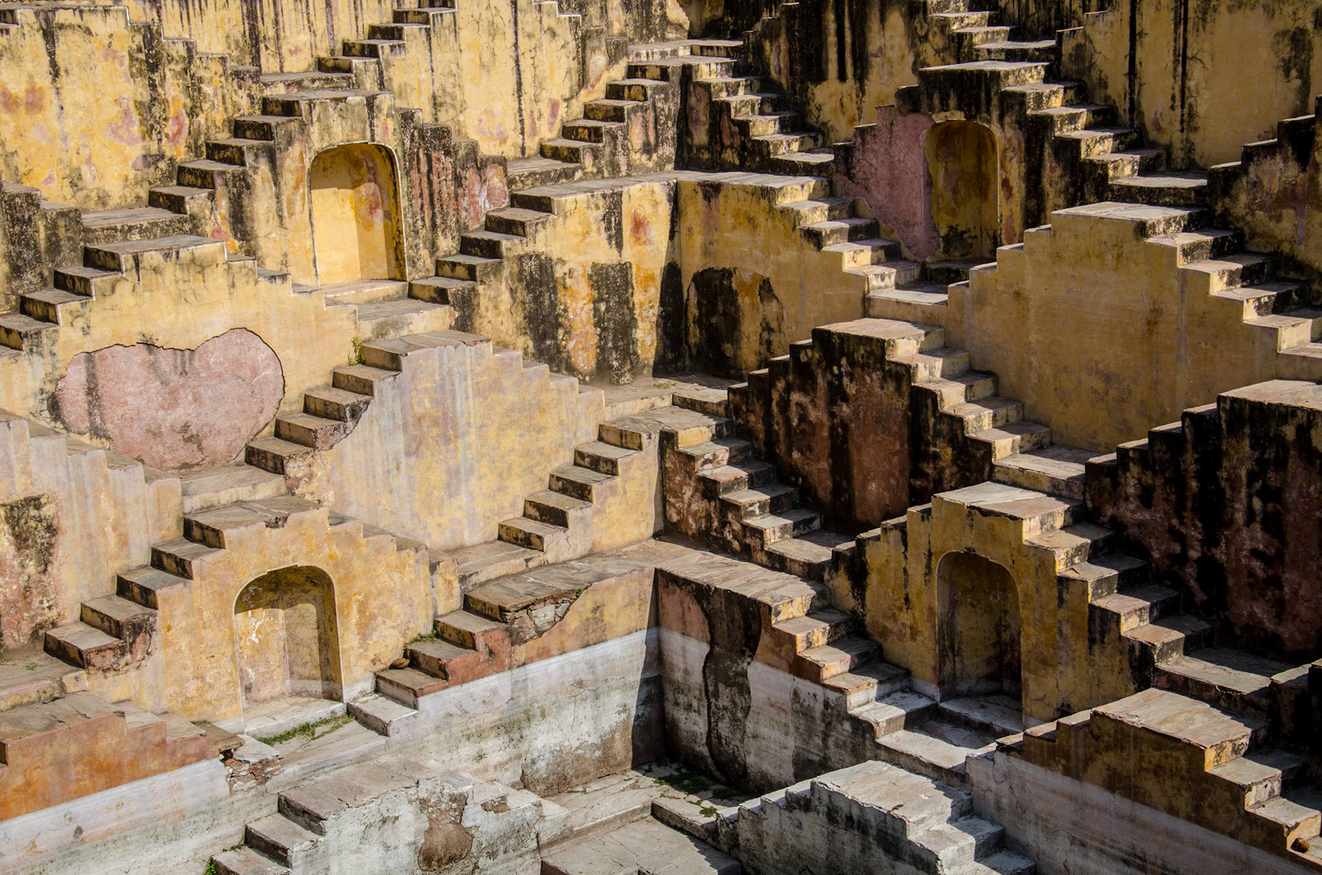 This is a close up of one of the largest stepwells in the world. It has over 3500 steps and is nearly 13 floors deep. It was built by King Chand Raja (hence the name) during the 8th and 9th centuries.